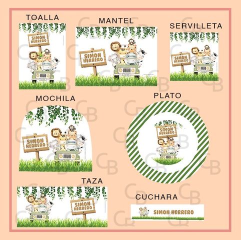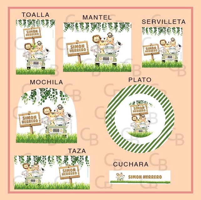 Toalla, mantel, servilleta, mochila, plato, taza, cuchara