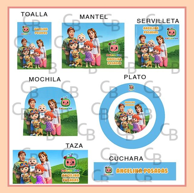 Toalla, mantel, servilleta, mochila, plato, taza, cuchara