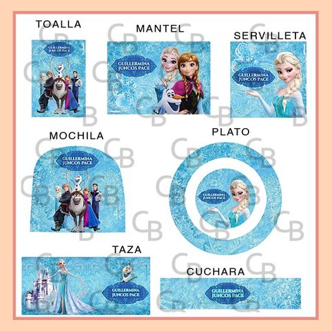 Toalla, mantel, servilleta, mochila, plato, taza, cuchara